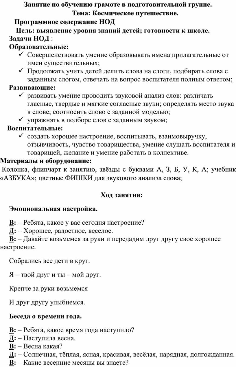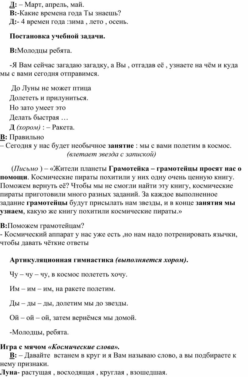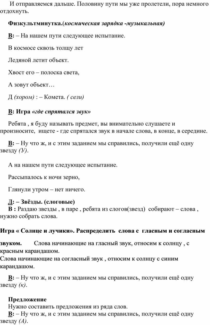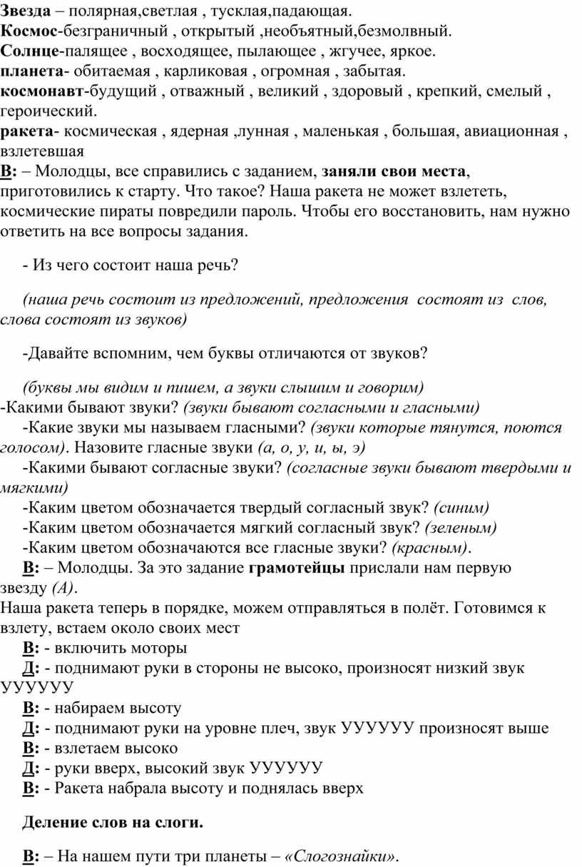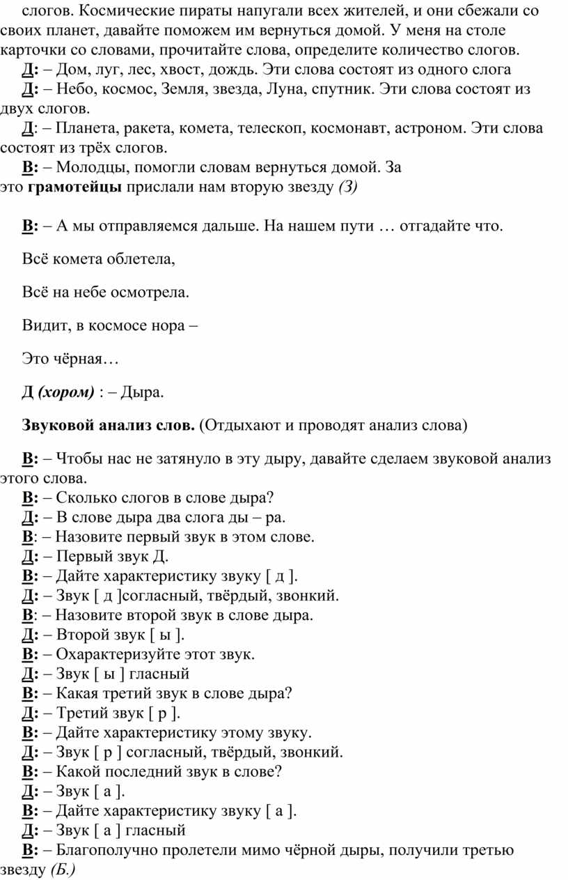 Д: – Небо, космос, Земля, звезда, Луна, спутник. Эти слова состоят из двух слогов.