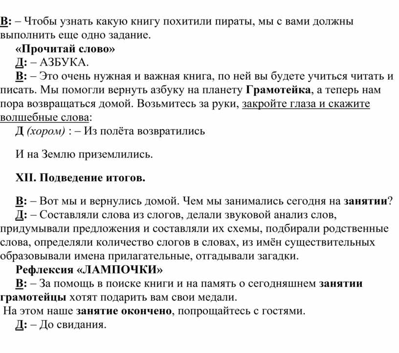 В: – Это очень нужная и важная книга, по ней вы будете учиться читать и писать. Мы помогли вернуть азбуку на планету Грамотейка, а теперь нам пора возвращаться домой. Возьмитесь за руки, закройте глаза и скажите волшебные слова: