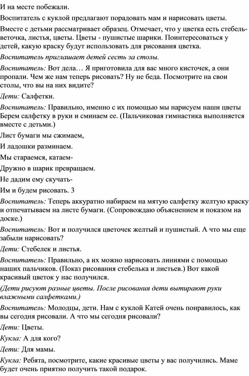 Воспитатель: Правильно, именно с их помощью мы нарисуем наши цветы Берем салфетку в руки и сминаем ее. (Пальчиковая гимнастика выполняется вместе с детьми.)