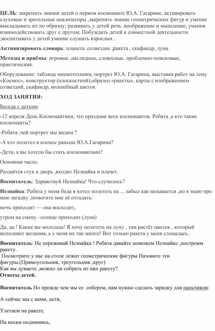 ЦЕЛЬ: закрепить знания детей о первом космонавте Ю.А. Гагарине, активировать слуховые и зрительные анализаторы ,закрепить знание геометрических фигур и умение выкладывать их по образцу; развивать у детей речь .воображение и мышление, умения взаимодействовать друг с другом; Побуждать детей к совместной деятельности ;воспитывать у детей умение слушать взрослых .