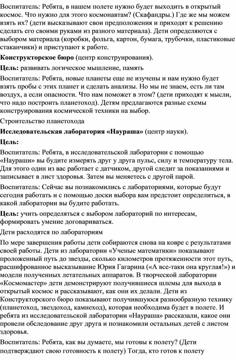 По мере завершения работы дети собираются снова на ковре с результатами своей работы. Дети из лаборатории «Ученые математики» показывают проложенный путь до звезды, сколько километров протяженности этот путь, расшифрованное высказывание Юрия Гагарина («А все-таки она круглая!») и модели полученных летательных аппаратов. В творческой лаборатории «Космомастер» дети демонстрируют получившиеся шлемы для выхода в открытый космос и рассказывают, как они их делали. Дети из Конструкторского бюро показывают получившуюся разнообразную технику (планетоход, звездоход, камнеход), которая необходима будет в полете. И ребята из исследовательской лаборатории «Наураша» рассказали, какое они провели обследование друг друга и познакомили остальных детей с листом здоровья.