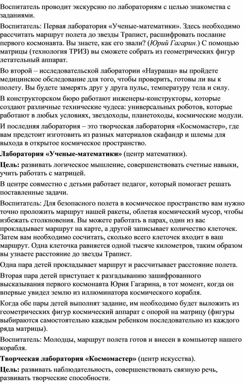 Воспитатель: Ребята, посмотрите внимательно, на что похожа наша с вами группа? (На лабораторию.) Нам предстоит большая подготовка к полету. Давайте познакомимся с лабораториями и что можно в них делать.