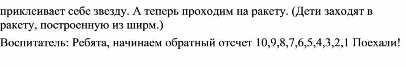 Воспитатель: Ребята, как вы думаете, мы готовы к полету? (Дети подтверждают свою готовность к полету) Тогда, кто готов к полету приклеивает себе звезду. А теперь проходим на ракету. (Дети заходят в ракету, построенную из ширм.)
