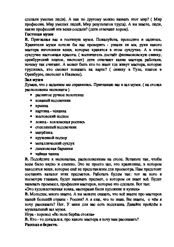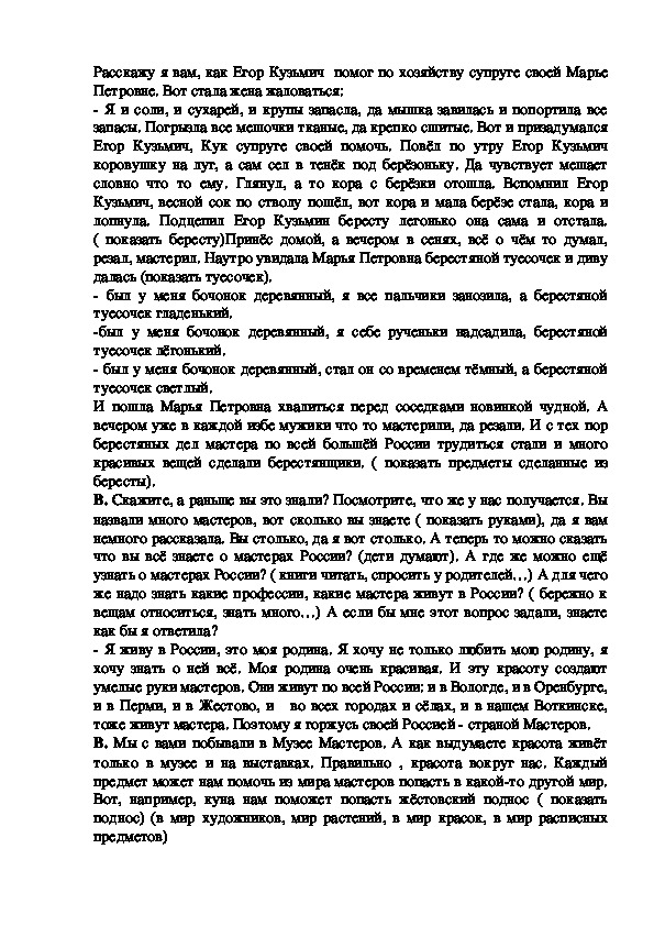 Мероприятие направлено на содействовие обогащению развития представлений ребенка об народных промыслах. Расширять представление о взаимодействии людей разных профессий. Способствовать формированию монологической - доказательной речи. Воспитывать чувство патриотизма через формирование ответственности, заинтересованности к результатам труда мастеров разных профессий, живущих в России.