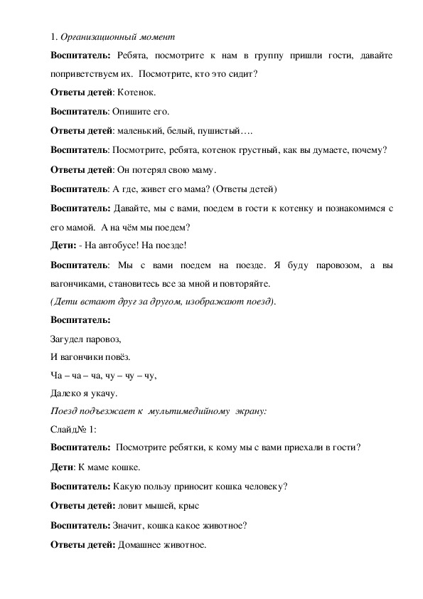 Воспитатель: Давайте, мы с вами, поедем в гости к котенку и познакомимся с
