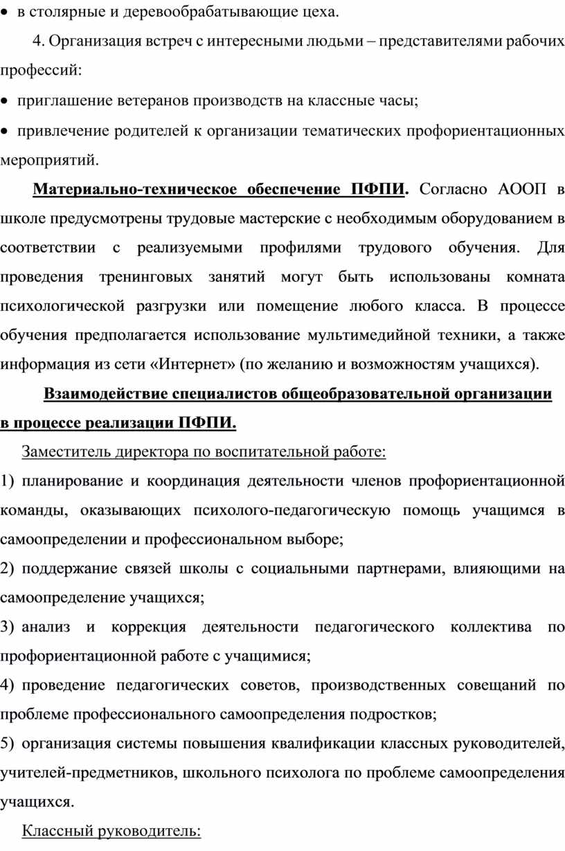 Материально-техническое обеспечение ПФПИ. Согласно АООП в школе предусмотрены трудовые мастерские с необходимым оборудованием в соответствии с реализуемыми профилями трудового обучения. Для проведения тренинговых занятий могут быть использованы комната психологической разгрузки или помещение любого класса. В процессе обучения предполагается использование мультимедийной техники, а также информация из сети «Интернет» (по желанию и возможностям учащихся).