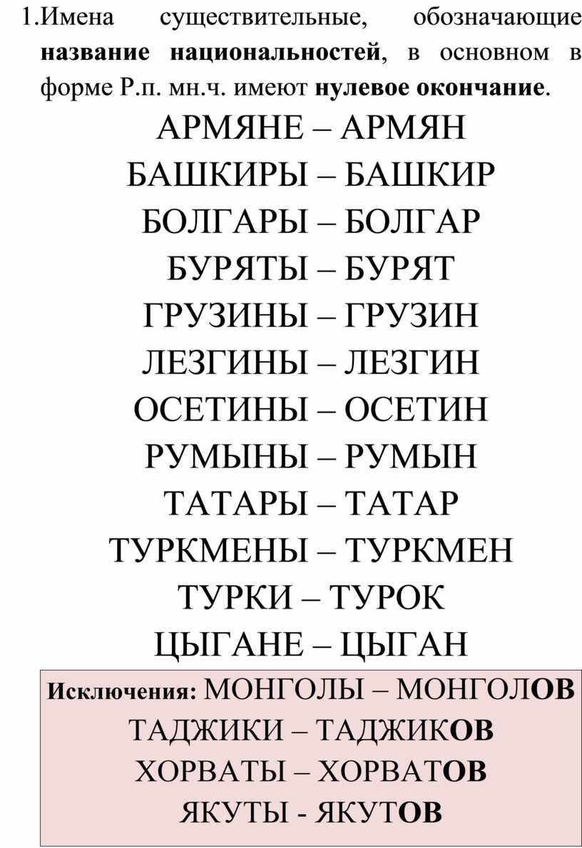 3.Имена существительные, обозначающие название национальностей, в основном в форме Р.п. мн.ч. имеют нулевое окончание.