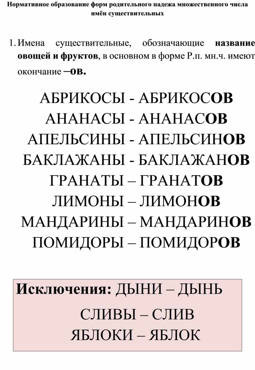 1. Имена существительные, обозначающие название овощей и фруктов, в основном в форме Р.п. мн.ч. имеют окончание –ов.