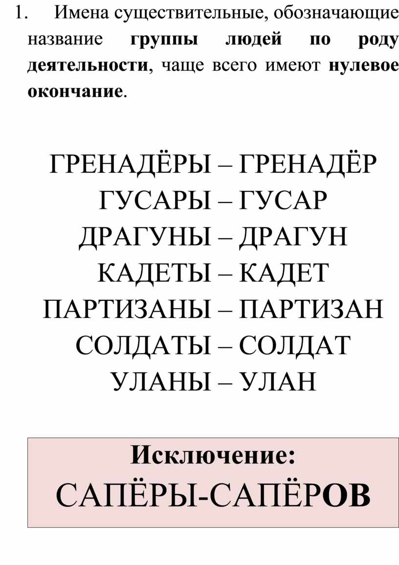 5. Имена существительные, обозначающие название группы людей по роду деятельности, чаще всего имеют нулевое окончание.
