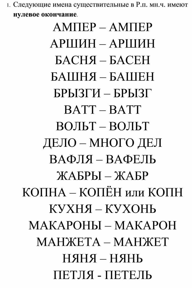 9. Следующие имена существительные в Р.п. мн.ч. имеют нулевое окончание.