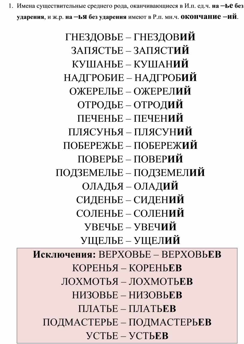 6. Имена существительные среднего рода, оканчивающиеся в И.п. ед.ч. на –ье без ударения, и ж.р. на –ья без ударения имеют в Р.п. мн.ч. окончание –ий.