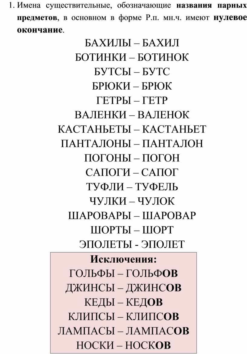 2. Имена существительные, обозначающие названия парных предметов, в основном в форме Р.п. мн.ч. имеют нулевое окончание.