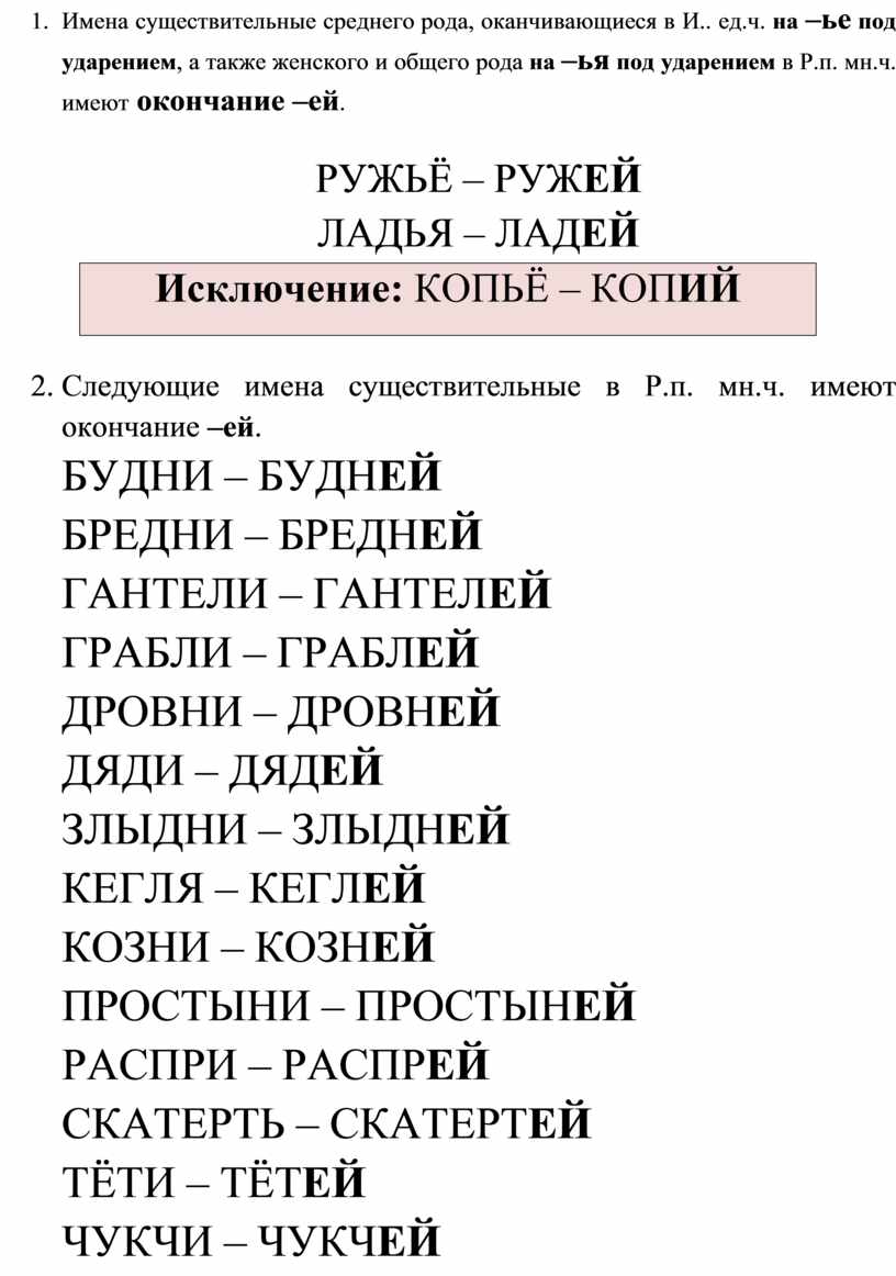 7. Имена существительные среднего рода, оканчивающиеся в И.. ед.ч. на –ье под ударением, а также женского и общего рода на –ья под ударением в Р.п. мн.ч. имеют окончание –ей.