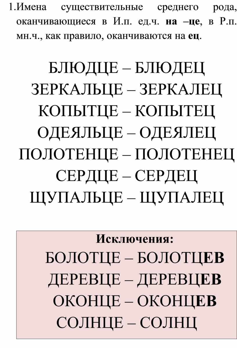 Исключения: БОЛОТЦЕ – БОЛОТЦЕВ ДЕРЕВЦЕ – ДЕРЕВЦЕВ ОКОНЦЕ – ОКОНЦЕВ СОЛНЦЕ – СОЛНЦ |