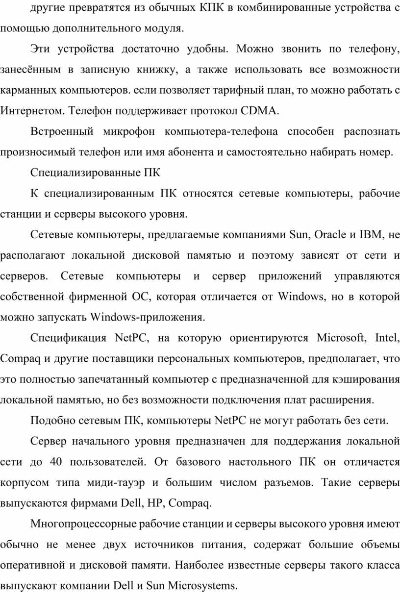 К специализированным ПК относятся сетевые компьютеры, рабочие станции и серверы высокого уровня.