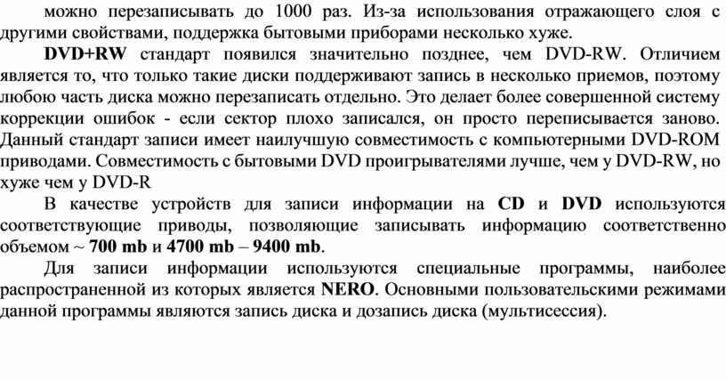 Для записи информации используются специальные программы, наиболее распространенной из которых является NERO. Основными пользовательскими режимами данной программы являются запись диска и дозапись диска (мультисессия).