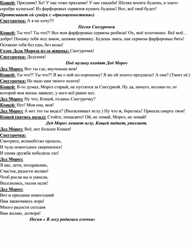 Кощей: В лесу-то мы её и встретим. Я притворюсь Дедом Морозом. Только Снегурочку мне надо какую-нибудь, чтобы поверили.