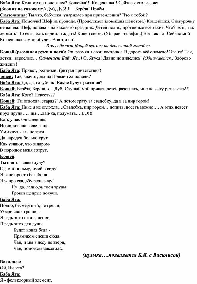 Баба Яга: Куда же он подевался? Кощейка!!! Кощеюшка!! Сейчас я его вызову. (Звонит по сотовому.) Дуб, Дуб! Я – Берёза! Приём…