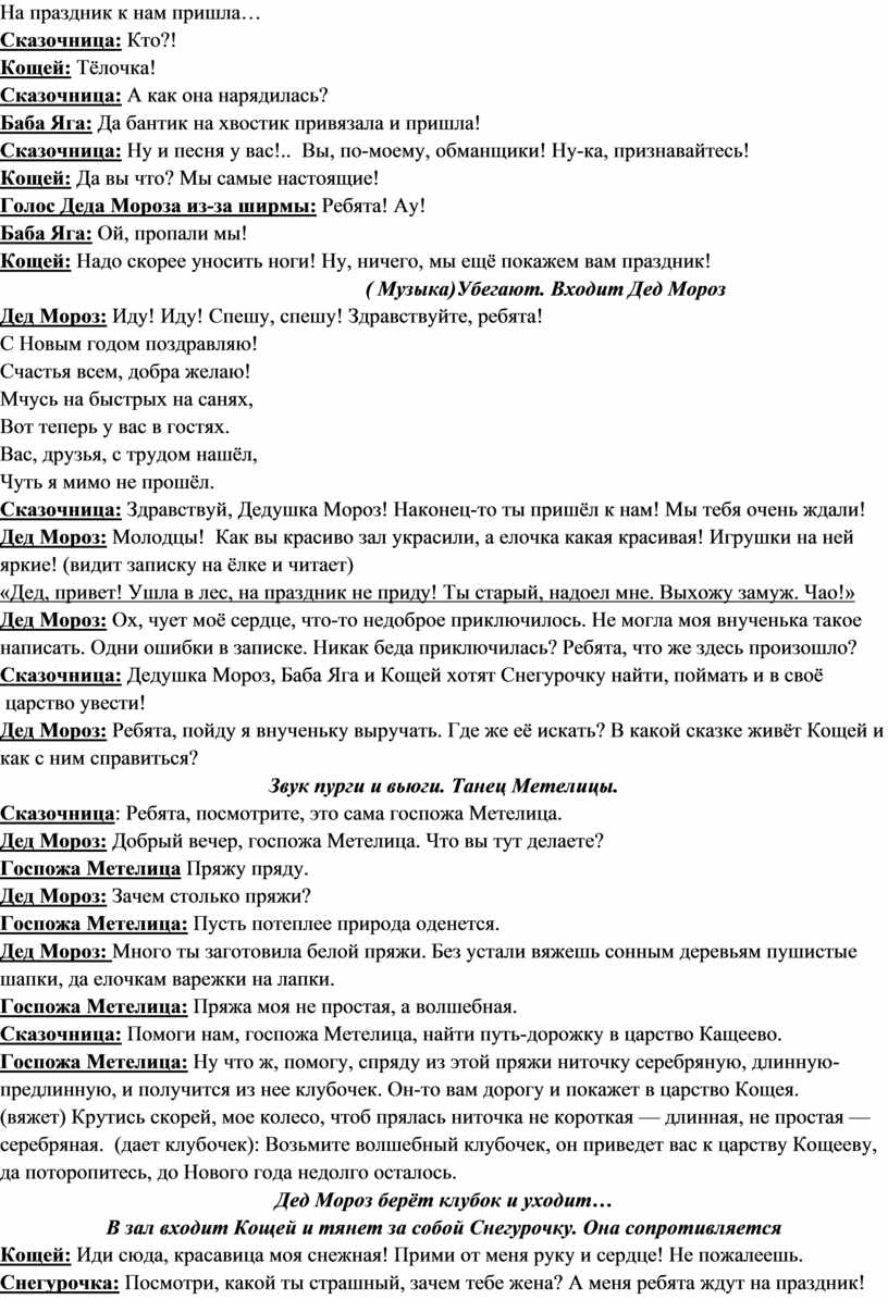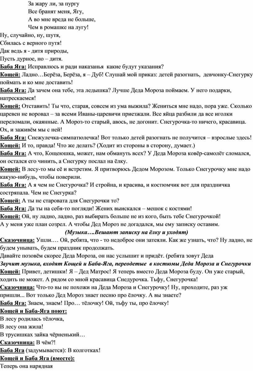 Баба Яга: Опаньки! Какая елочка! Пушистая, зеленая, уже с игрушками. (К детям) Чего уставились! Кто за вас со Снегурочкой здороваться будет? Небось, заждались меня? А я к вам так спешила, так торопилась, все ножки истоптала, десять метелок сломала… Разве это метелки? Тьфу! Вот раньше – это да!.. Метёлки были, куда прикажешь – туда и летят. Делал мне Леший метёлки из самой стройненькой беленькой берёзки, а сейчас?! Да разве это берёза? Эх, ерунда! Ну ладно. Ну че узнали меня? Хорошая я Снегурочка? (Дети отвечают) Что?! Не нравлюсь?! Сегодня я здесь хозяйка! А кому не нравится, того я без праздника оставлю. Так что, давайте, развлекайте меня! Подарочками одаривайте, стишками позабавьте и про конфеты «Мишка на севере» не забудьте!