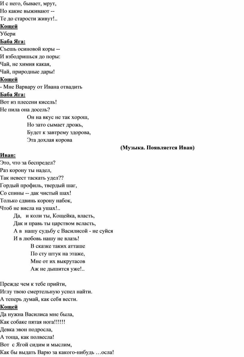 Кощей (разминая руки и ноги): Ох, размял я свои косточки. В дороге всё онемело! Эге-ге! Так, детки.. взрослые… (Замечает Бабу Ягу.) О, Ягуся! Давно не виделись! (Обнимаются.) Здорово живёшь!