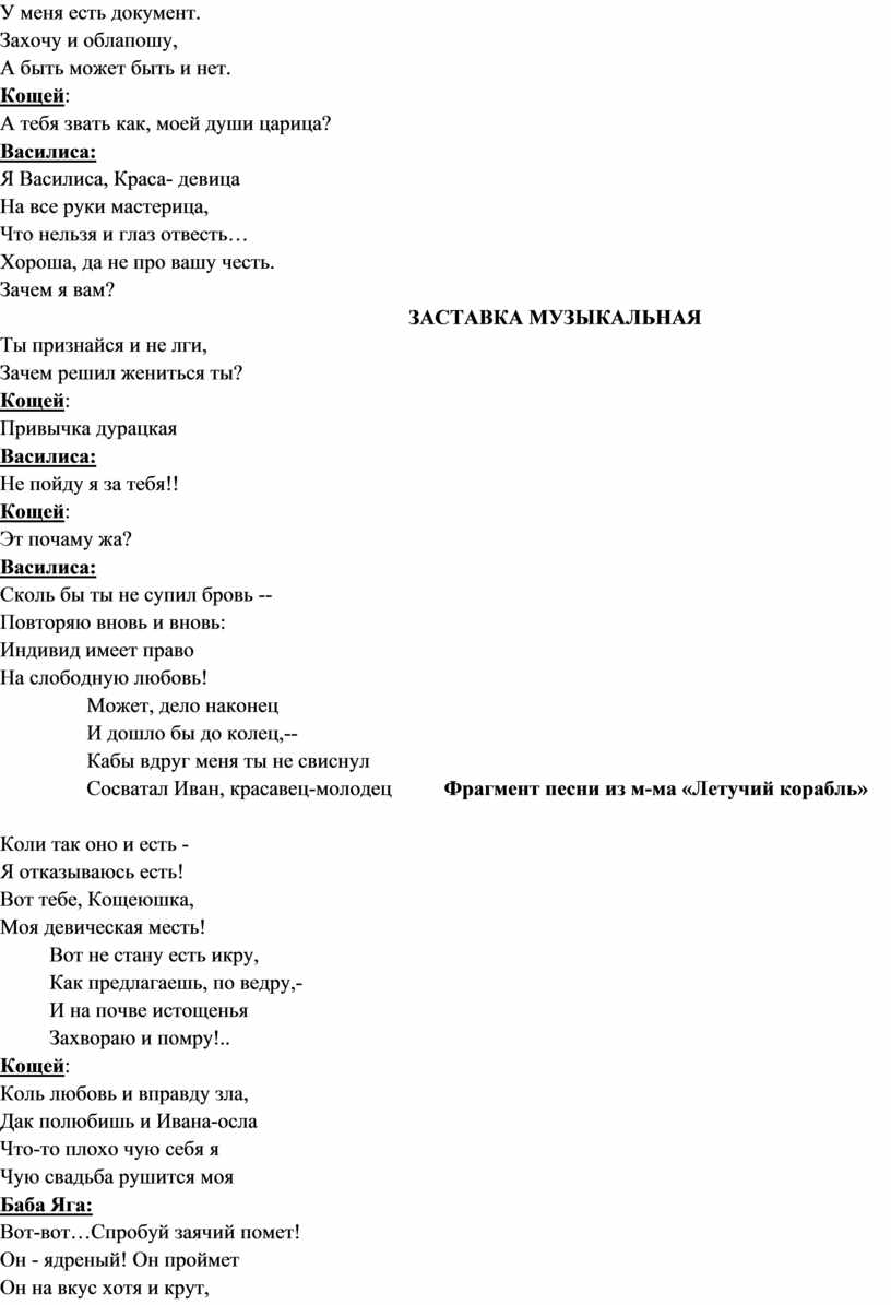 Кощей: Праздник! Хе! У нас тоже праздник! У нас свадьба! Шелка носить будешь, в злате-серебре купаться! Из фарфоровых сервизов кушать будешь! Вот, всё твоё будет! Протягивает ей сундук с «драгоценностями»)