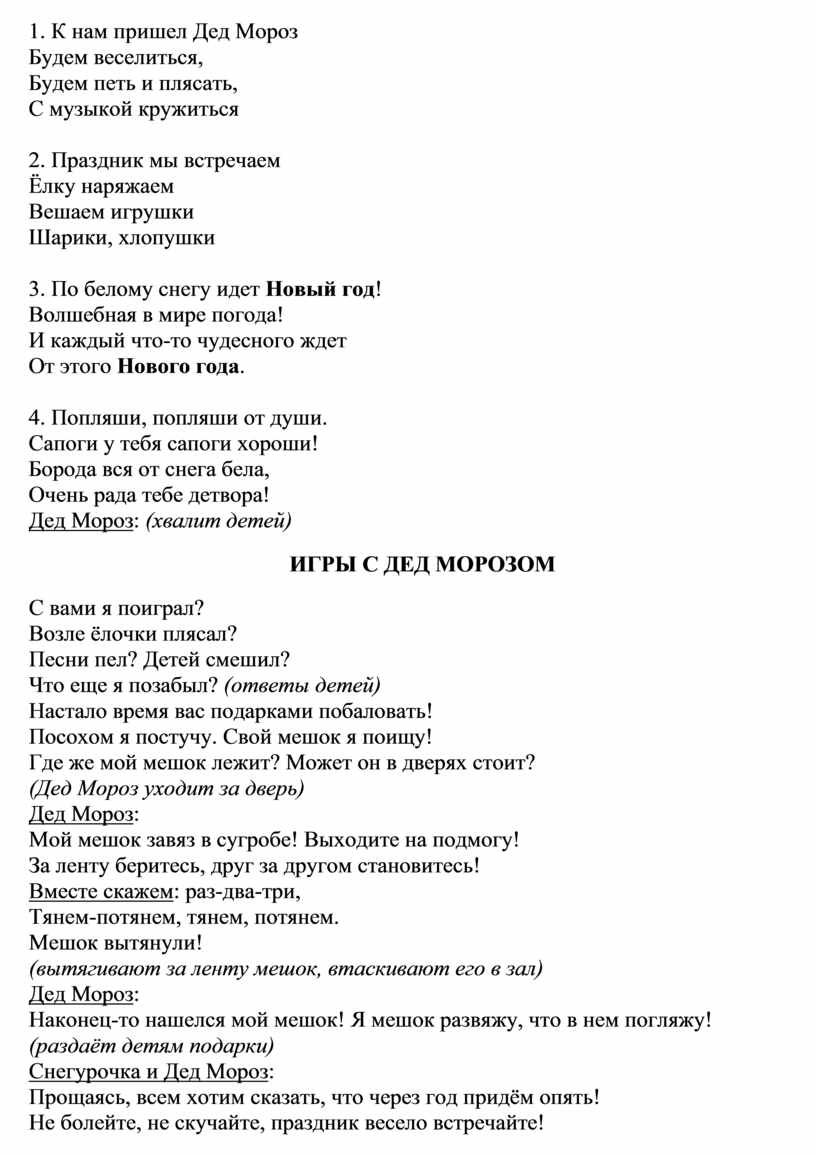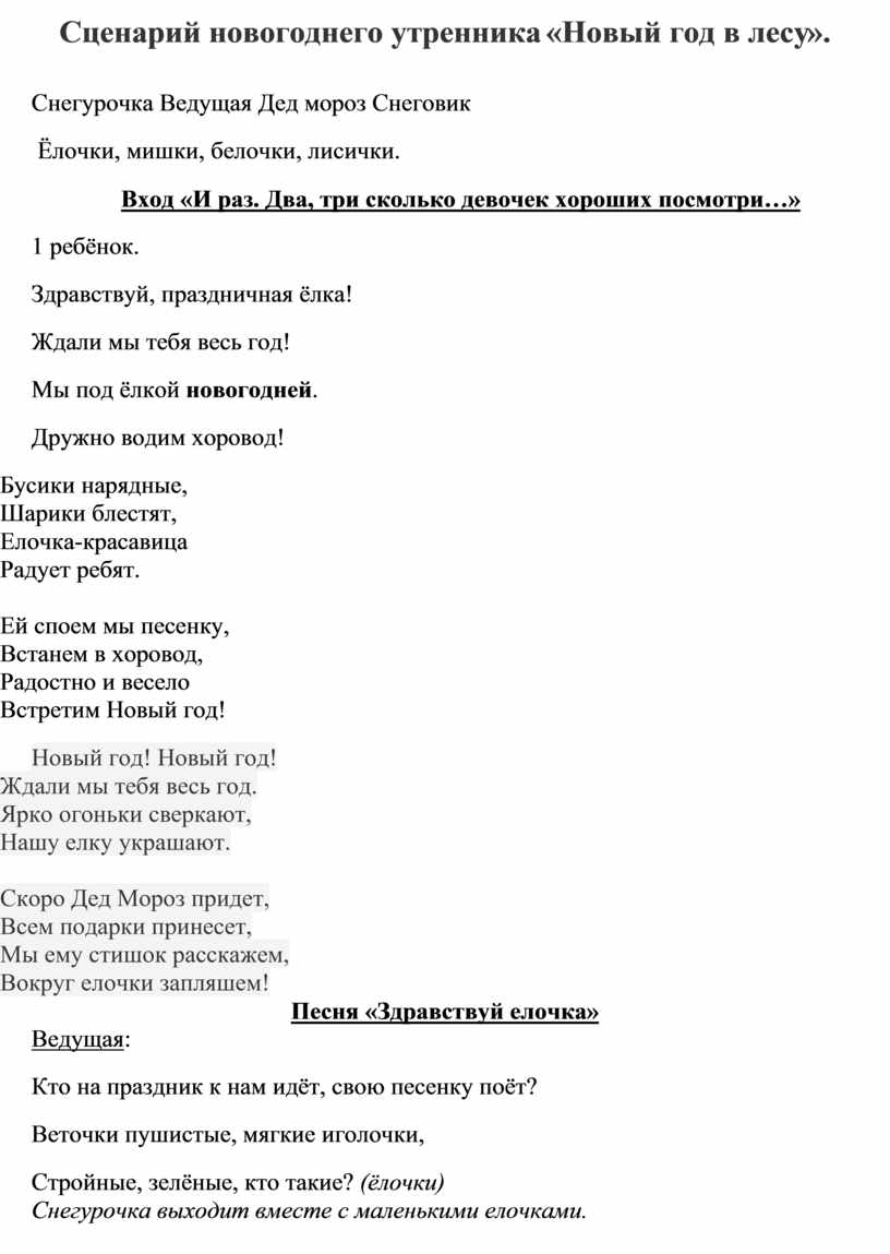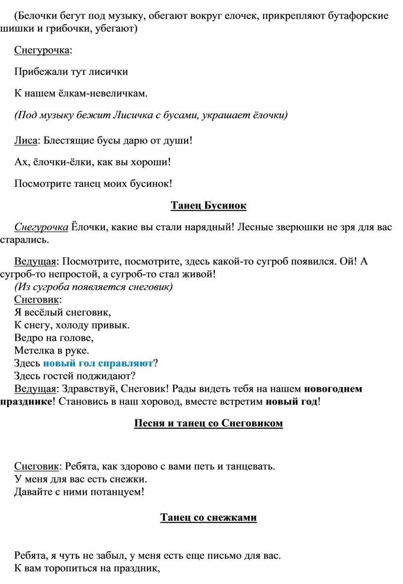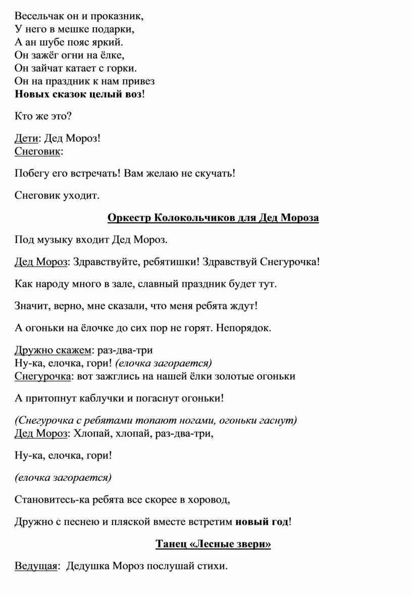 Ведущая: Здравствуй, Снеговик! Рады видеть тебя на нашем новогоднем празднике! Становись в наш хоровод, вместе встретим новый год!