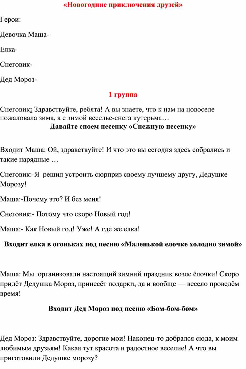 Маша и Елка (вбегает в группу):Привет-привет, ребята! Сегодня у нас волшебный праздник — Новый год! А знаете, кого я пригласила? Настоящего Дедушку Мороза! А вот и он сам едет на санях! (Машет рукой с колокольчиком, привлекая внимание)