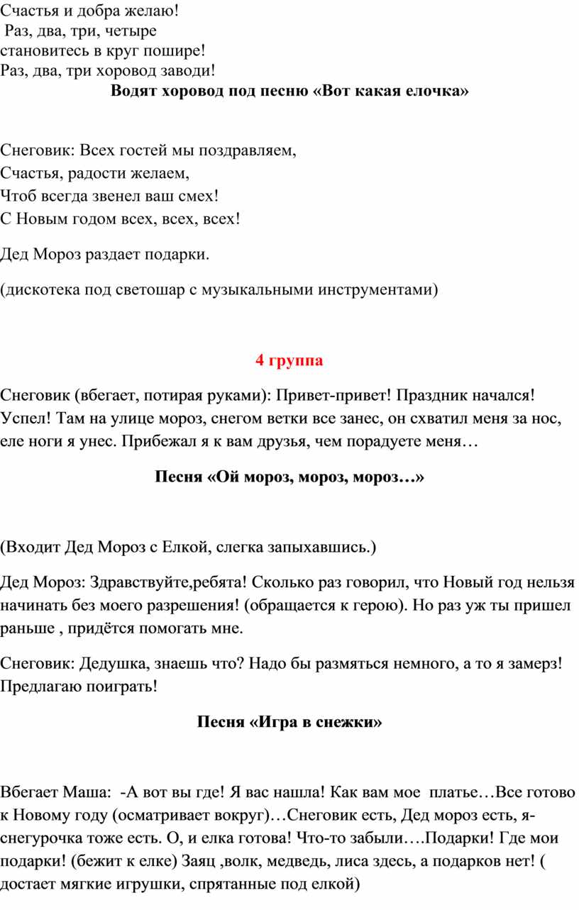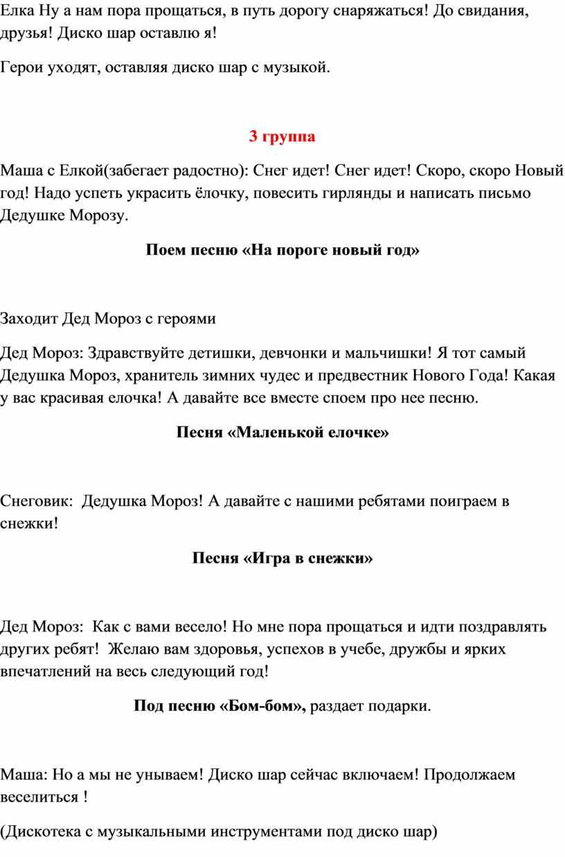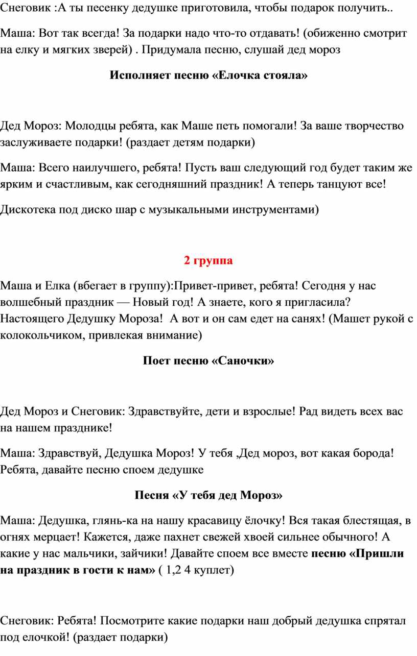 Маша: Дедушка, глянь-ка на нашу красавицу ёлочку! Вся такая блестящая, в огнях мерцает! Кажется, даже пахнет свежей хвоей сильнее обычного! А какие у нас мальчики, зайчики! Давайте споем все вместе песню «Пришли на праздник в гости к нам» ( 1,2 4 куплет)