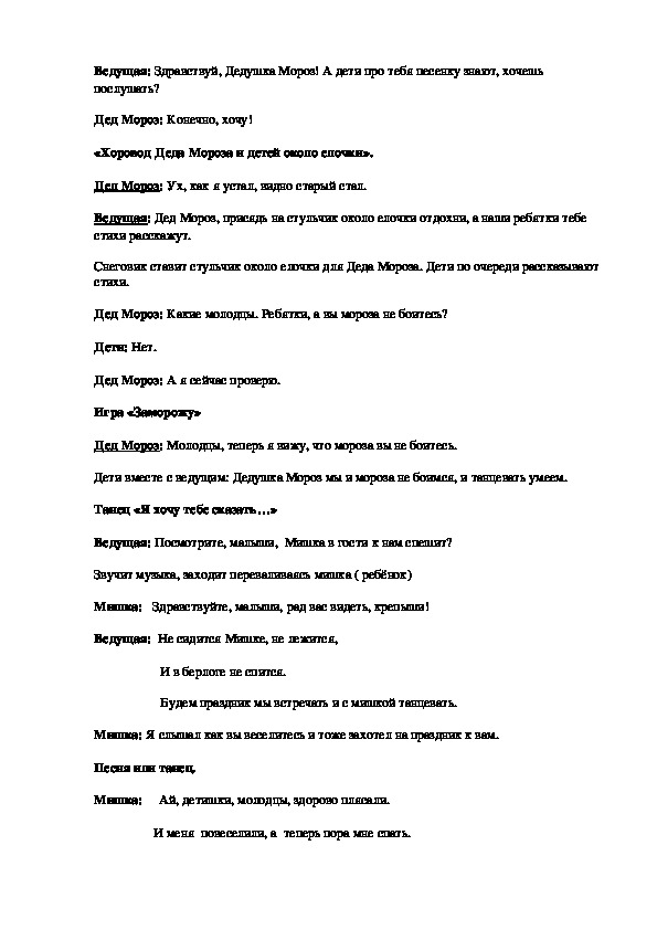 вам спешил на праздник я. С Новым годом поздравляю и здоровья всем желаю.Ведущая: Здравствуй, Дедушка Мороз! А дети про тебя песенку знают, хочешь