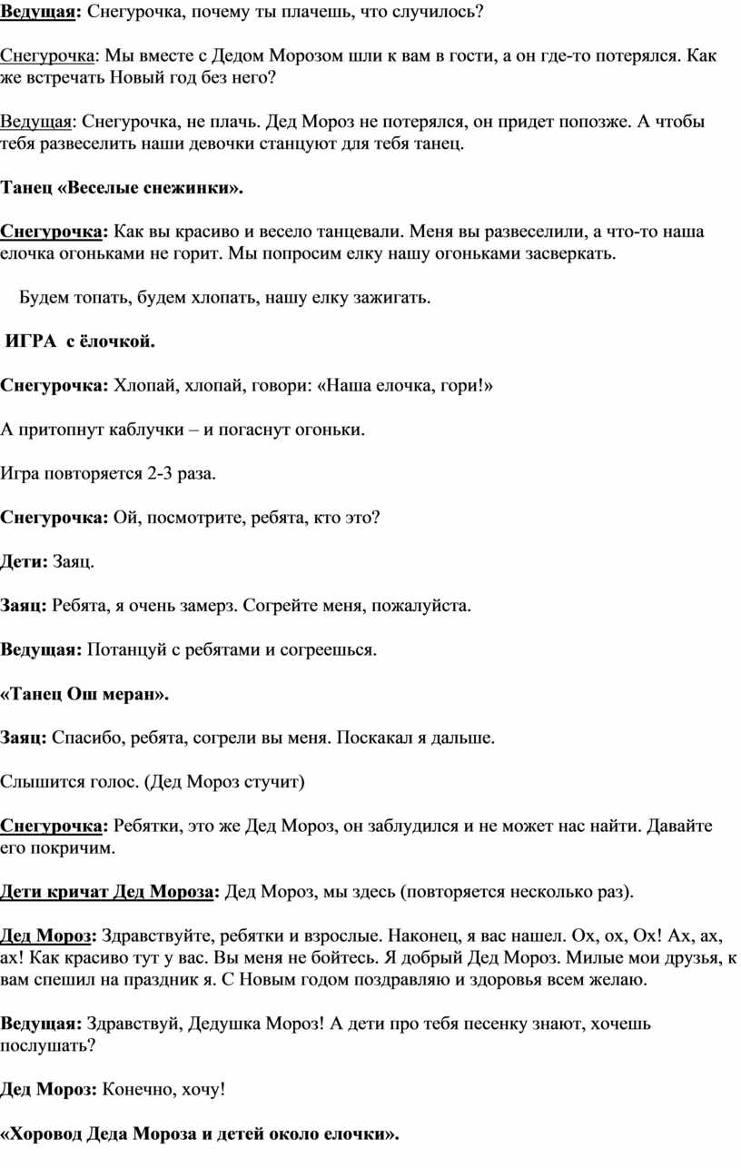 Снегурочка: Как вы красиво и весело танцевали. Меня вы развеселили, а что-то наша елочка огоньками не горит. Мы попросим елку нашу огоньками засверкать.