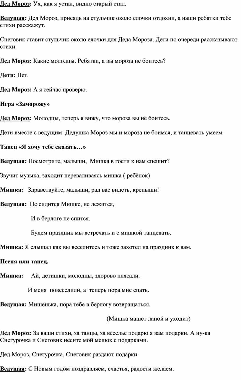 Дед Мороз: Здравствуйте, ребятки и взрослые. Наконец, я вас нашел. Ох, ох, Ох! Ах, ах, ах! Как красиво тут у вас. Вы меня не бойтесь. Я добрый Дед Мороз. Милые мои друзья, к вам спешил на праздник я. С Новым годом поздравляю и здоровья всем желаю.