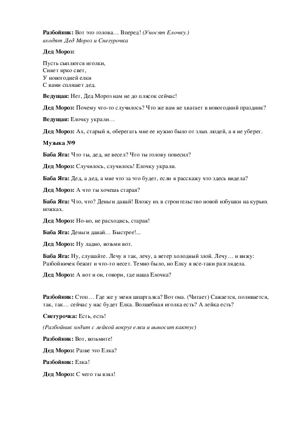 Дед Мороз: С чего ты взял!Разбойник: Как же? Зеленая?...Зеленая! Колючая?... Колючая! Иголки есть?... Есть!