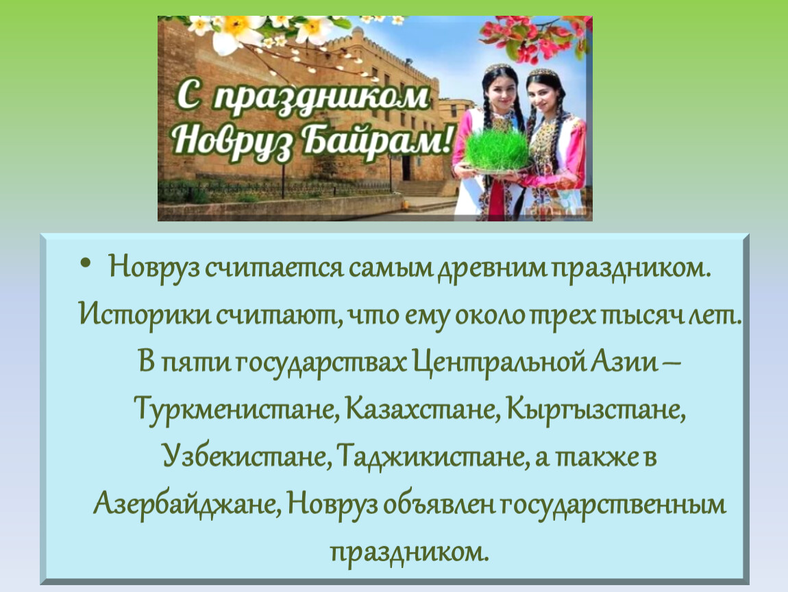 Новруз считается самым древним праздником. Историки считают, что ему около трех тысяч лет. В пяти государствах Центральной Азии – Туркменистане, Казахстане, Кыргызстане, Узбекистане, Таджикистане, а также в Азербайджане, Новруз объявлен государственным праздником.