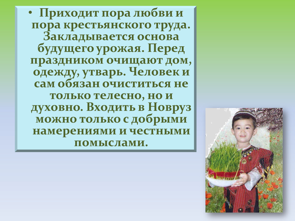 Приходит пора любви и пора крестьянского труда. Закладывается основа будущего урожая. Перед праздником очищают дом, одежду, утварь. Человек и сам обязан очиститься не только телесно, но и духовно. Входить в Новруз можно только с добрыми намерениями и честными помыслами.
