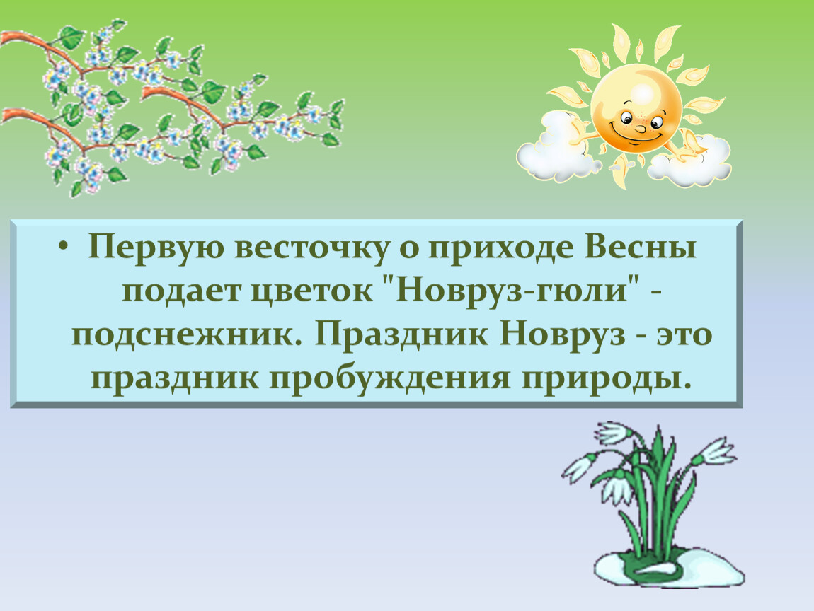 Первую весточку о приходе Весны подает цветок "Новруз-гюли" - подснежник. Праздник Новруз - это праздник пробуждения природы.