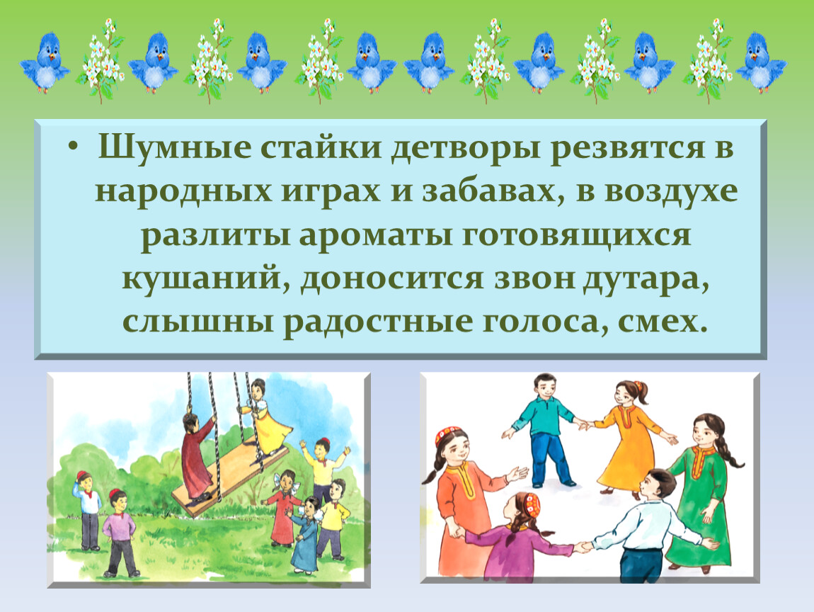 Шумные стайки детворы резвятся в народных играх и забавах, в воздухе разлиты ароматы готовящихся кушаний, доносится звон дутара, слышны радостные голоса, смех.