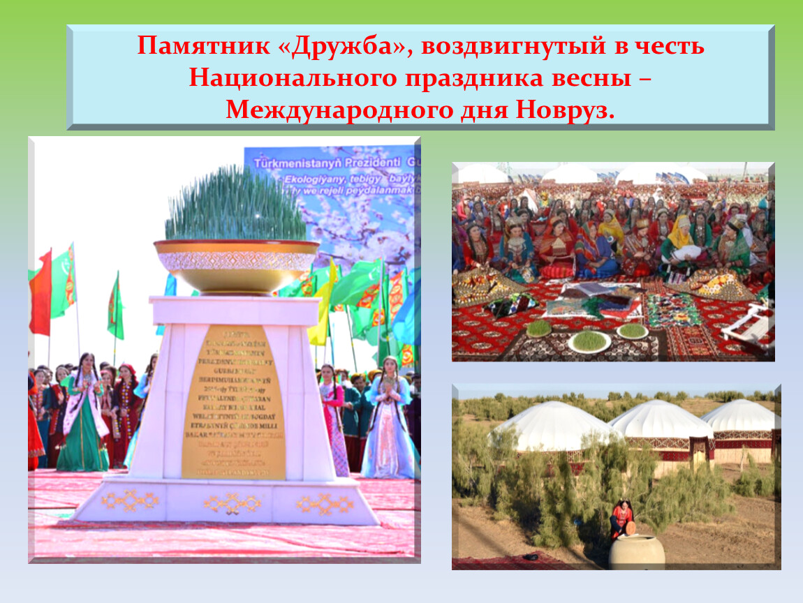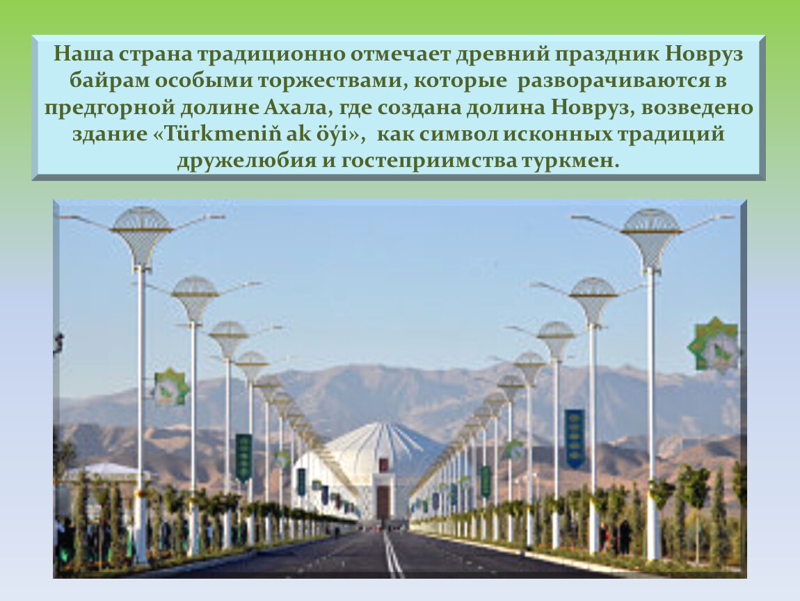 Наша страна традиционно отмечает древний праздник Новруз байрам особыми торжествами, которые разворачиваются в предгорной долине Ахала, где создана долина Новруз, возведено здание «Türkmeniň ak öýi», как символ исконных традиций дружелюбия и гостеприимства туркмен.