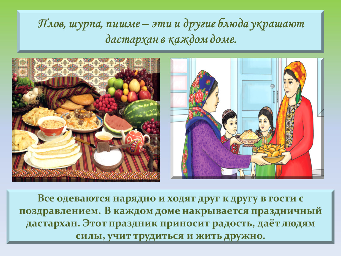 Все одеваются нарядно и ходят друг к другу в гости с поздравлением. В каждом доме накрывается праздничный дастархан. Этот праздник приносит радость, даёт людям силы, учит трудиться и жить дружно.