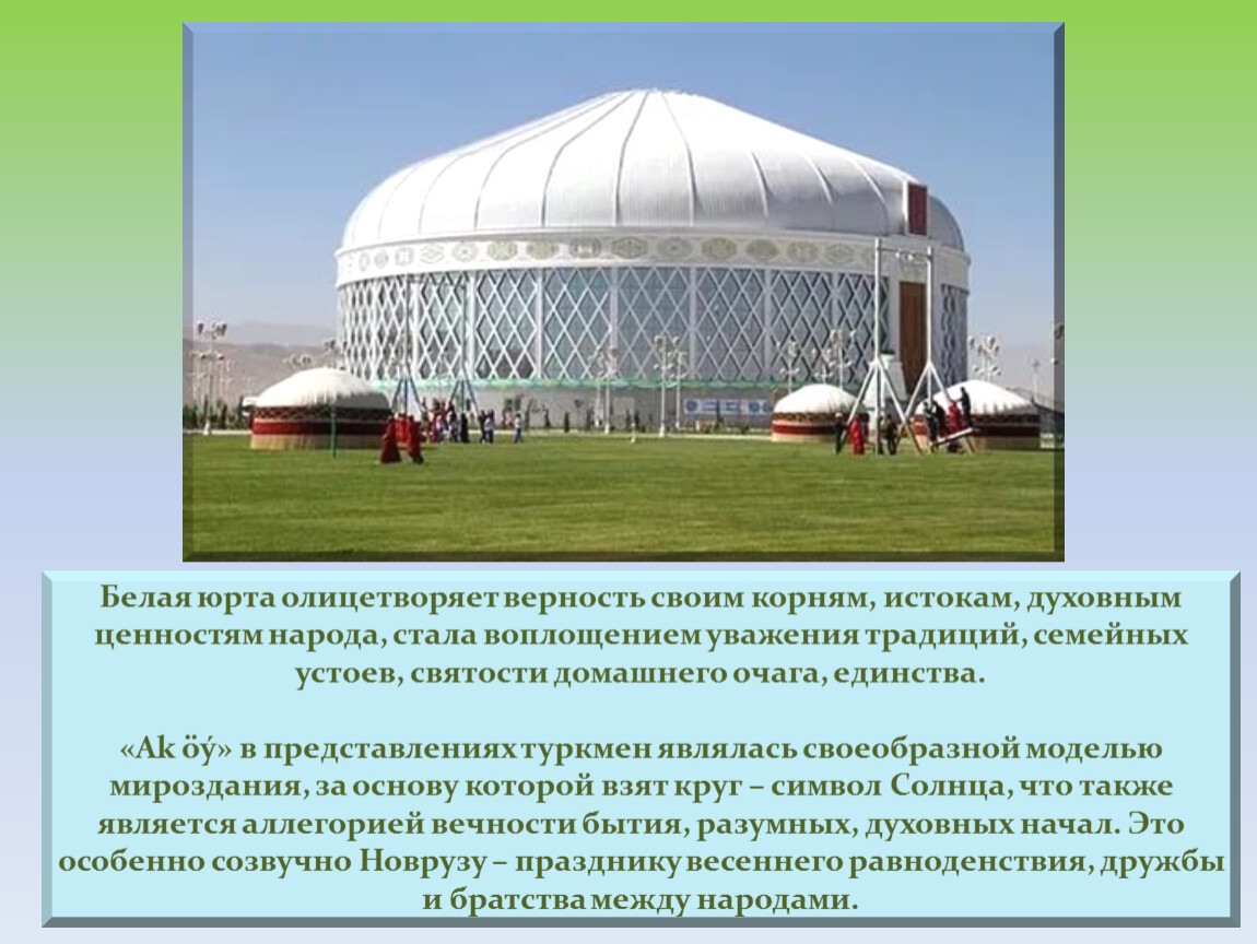 «Ak öý» в представлениях туркмен являлась своеобразной моделью мироздания, за основу которой взят круг – символ Солнца, что также является аллегорией вечности бытия, разумных, духовных начал. Это особенно созвучно Новрузу – празднику весеннего равноденствия, дружбы и братства между народами.