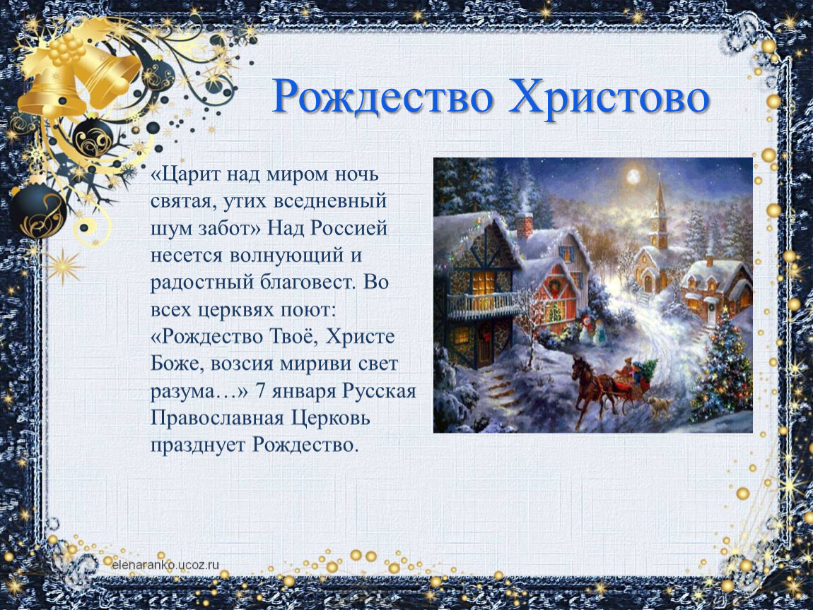 «Царит над миром ночь святая, утих вседневный шум забот» Над Россией несется волнующий и радостный благовест. Во всех церквях поют: «Рождество Твоё, Христе Боже, возсия мириви свет разума…» 7 января Русская Православная Церковь празднует Рождество.
