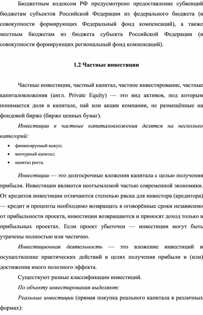 Инвестиции в частные капиталовложения делятся на несколько категорий: