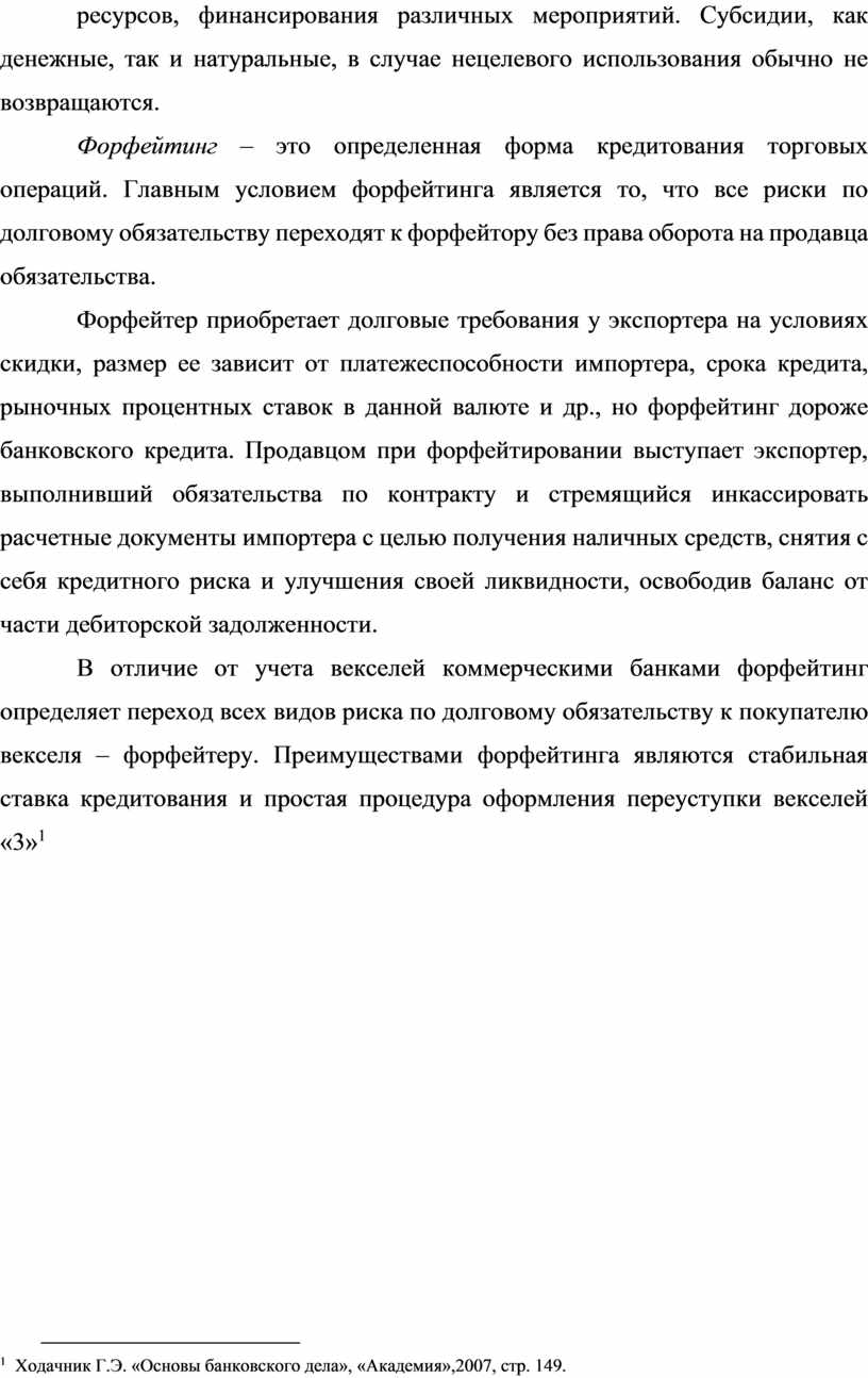В отличие от учета векселей коммерческими банками форфейтинг определяет переход всех видов риска по долговому обязательству к покупателю векселя – форфейтеру. Преимуществами форфейтинга являются стабильная ставка кредитования и простая процедура оформления переуступки векселей «3»[1]