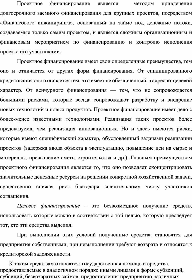 Проектное финансирование — это финансирование инвестиционных проектов, при котором источником обслуживания долговых обязательств являются денежные потоки, генерируемые проектом. Специфика этого вида инвестирования состоит в том, что оценка затрат и доходов осуществляется с учетом распределения риска между участниками проекта.