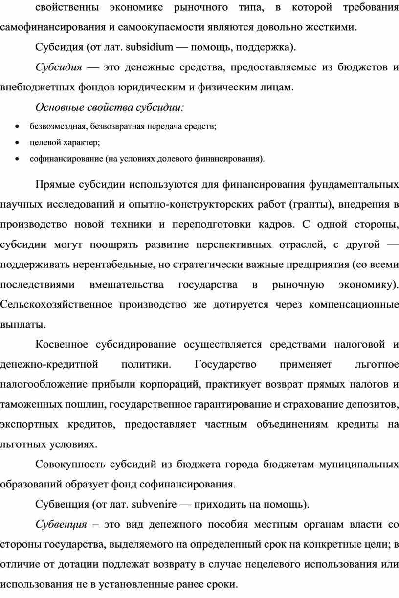 Субвенция – это вид денежного пособия местным органам власти со стороны государства, выделяемого на определенный срок на конкретные цели; в отличие от дотации подлежат возврату в случае нецелевого использования или использования не в установленные ранее сроки.