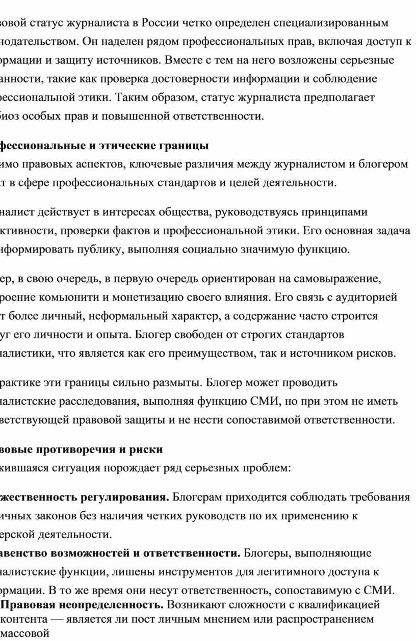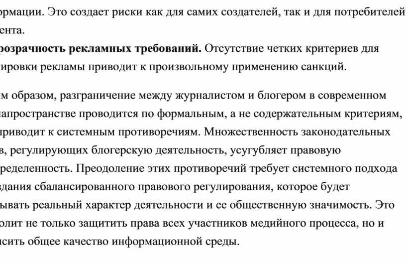 Таким образом, разграничение между журналистом и блогером в современном медиапространстве проводится по формальным, а не содержательным критериям, что приводит к системным противоречиям. Множественность законодательных актов, регулирующих блогерскую деятельность, усугубляет правовую неопределенность. Преодоление этих противоречий требует системного подхода и создания сбалансированного правового регулирования, которое будет учитывать реальный характер деятельности и ее общественную значимость. Это позволит не только защитить права всех участников медийного процесса, но и повысить общее качество информационной среды.