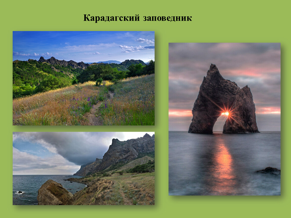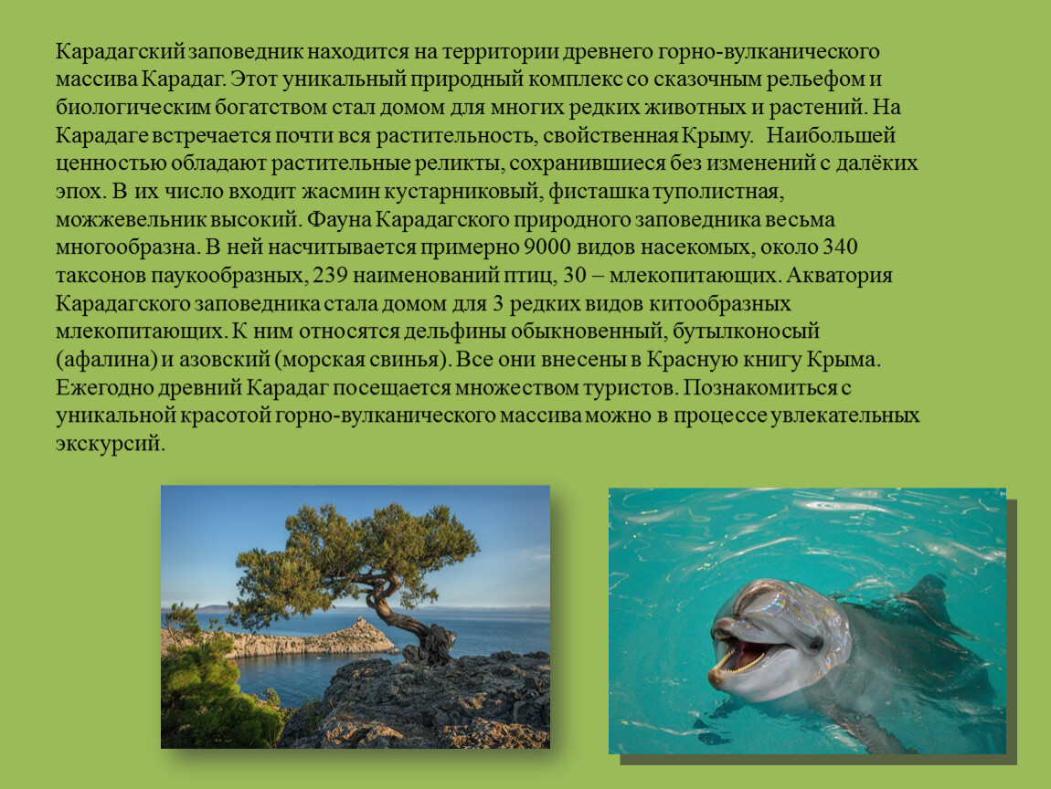 Карадагский заповедник находится на территории древнего горно-вулканического массива Карадаг. Этот уникальный природный комплекс со сказочным рельефом и биологическим богатством стал домом для многих редких животных и растений. На Карадаге встречается почти вся растительность, свойственная Крыму. Наибольшей ценностью обладают растительные реликты, сохранившиеся без изменений с далёких эпох. В их число входит жасмин кустарниковый, фисташка туполистная, можжевельник высокий. Фауна Карадагского природного заповедника весьма многообразна. В ней насчитывается примерно 9000 видов насекомых, около 340 таксонов паукообразных, 239 наименований птиц, 30 – млекопитающих. Акватория Карадагского заповедника стала домом для 3 редких видов китообразных млекопитающих. К ним относятся дельфины обыкновенный, бутылконосый (афалина) и азовский (морская свинья). Все они внесены в Красную книгу Крыма.