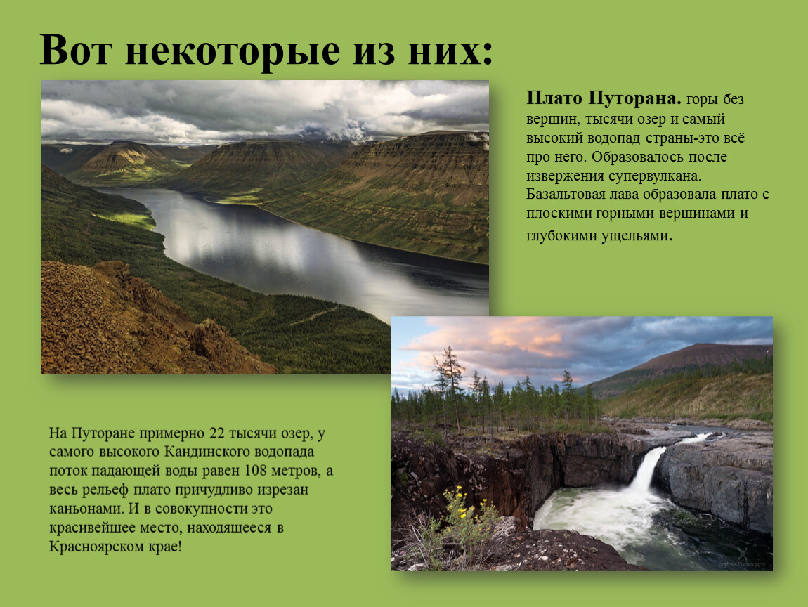 На Путоране примерно 22 тысячи озер, у самого высокого Кандинского водопада поток падающей воды равен 108 метров, а весь рельеф плато причудливо изрезан каньонами. И в совокупности это красивейшее место, находящееся в Красноярском крае!