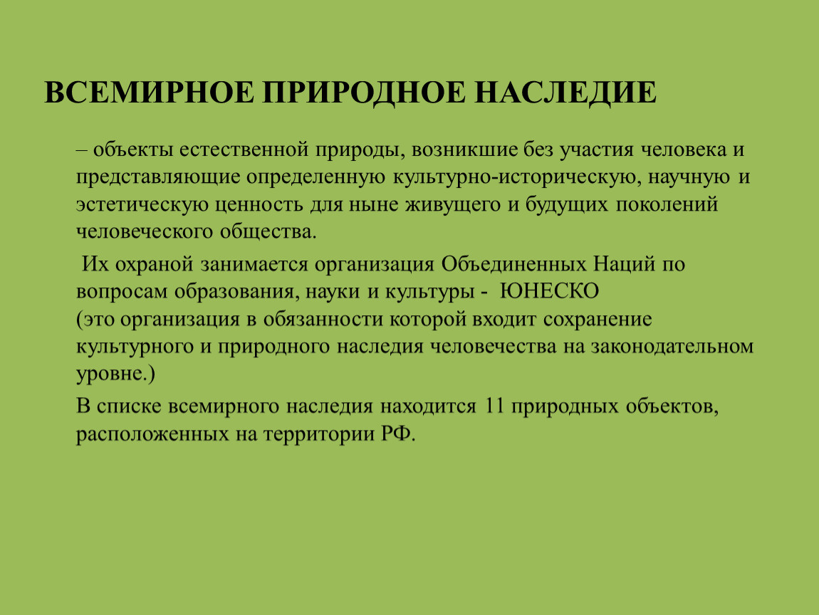 – объекты естественной природы, возникшие без участия человека и представляющие определенную культурно-историческую, научную и эстетическую ценность для ныне живущего и будущих поколений человеческого общества.