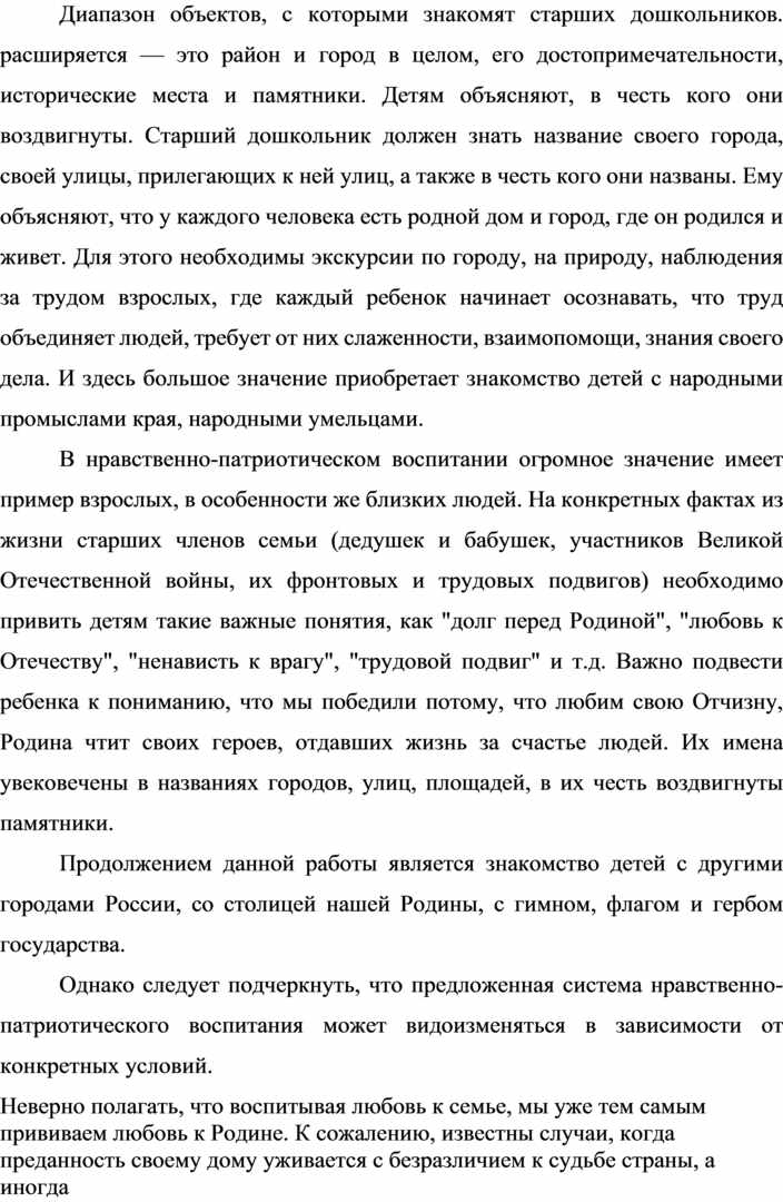 В настоящее время выходит достаточно много методической литературы по данному вопросу. Зачастую в ней освещаются лишь отдельные стороны нравственно-патриотического воспитания детей в конкретных видах деятельности и нет стройной системы, отражающей всю полноту данного вопроса. Видимо, это закономерно, поскольку чувство патриотизма многогранно по содержанию. Это и любовь к родным местам, и гордость за свой народ, и ощущение своей неразрывности с окружающим миром, и желание сохранять и приумножить богатство своей страны.