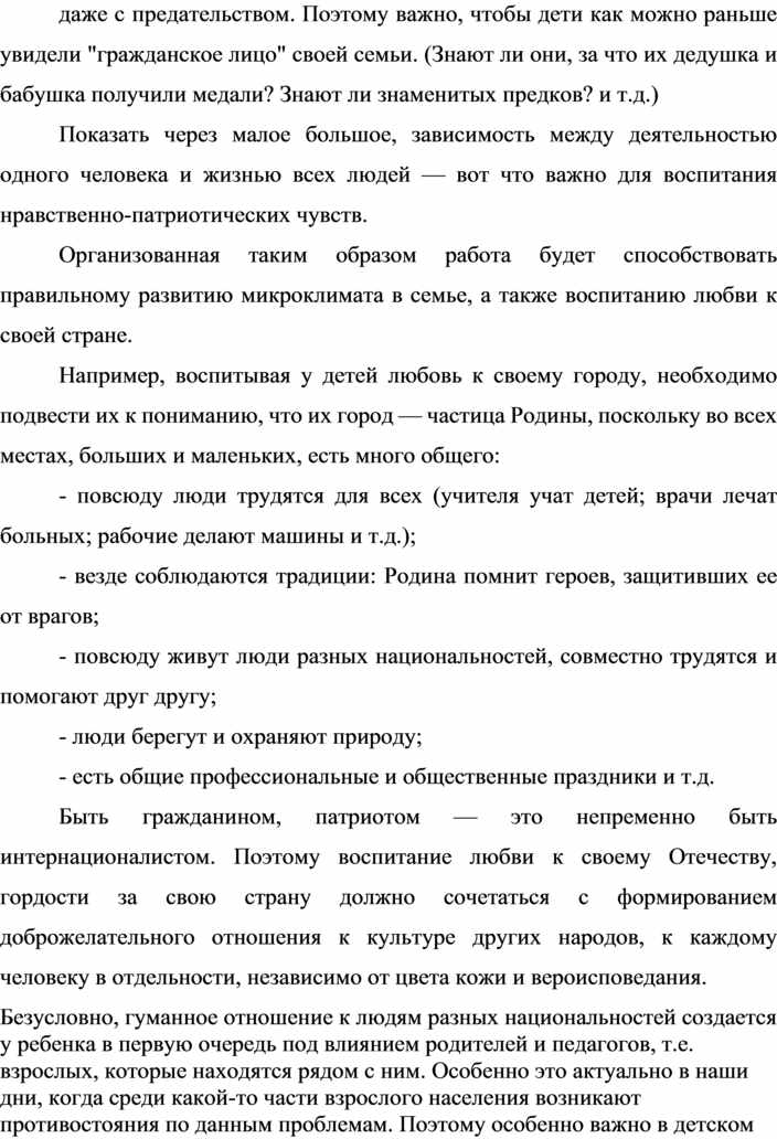 Например, воспитывая у детей любовь к своему городу, необходимо подвести их к пониманию, что их город — частица Родины, поскольку во всех местах, больших и маленьких, есть много общего: